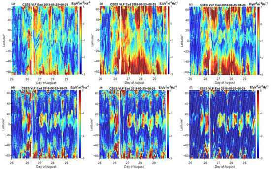 The electric spectrum time series with geographic latitude at 6 frequency bands ((a): 225 Hz; (b): 725 Hz; (c): 1125 Hz; (d): 5000 Hz; (e): 7500 Hz; (f): 13,500 Hz) in local daytime from 25 to 29 August in 2018.