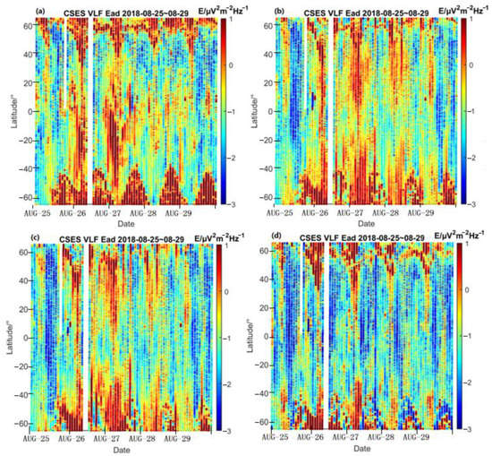 In local nighttime, four frequency points in VLF electric field were selected from CSES and exhibited in Figure 3. The similar variational trend was observed from 25 August until 29 during the whole magnetic storm event. At 225 Hz (Figure 3a), the regular peak structures can be found at latitude of 40–65° each day, typically in the southern hemisphere with strong electric field perturbations. Compared with the background at the quiet time of first half day on 25 August, the enhanced electric field signals can also be distinguished at low latitude (−40)° S–20° N following the final half day of 25 to 27 August, which occurred at different longitudinal region with those at the southern latitude of 40–65° S, but at almost the same time with those at the northern side (Figure 3a). At 725 Hz and 1125 Hz (Figure 3b–c), the regular structures at 40–65° were broken through, while the strong signals propagated to the low latitude of 10–40° at both hemispheres and crossed the equatorial area on 26 and 27 August. At 7500 Hz (Figure 3d), the regular peak electric field structure was maintained at the northern latitude of 40–65°, being similar with those at 225 Hz, but it did not extend to low latitudes, except for the specific peak time on 27 August. From the local nighttime results, the electric field showed significant perturbations on 26 and 27 August, and those signals were even stronger on 27 August, which demonstrates the continuous impact on the ionosphere from this storm during its recovery phase.