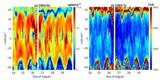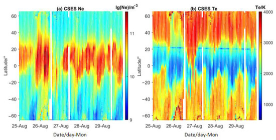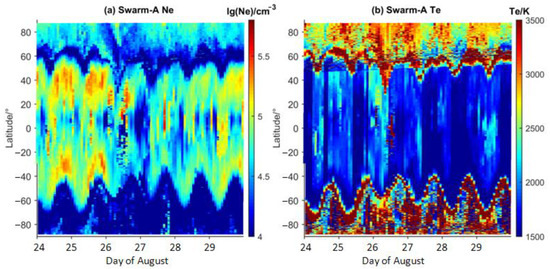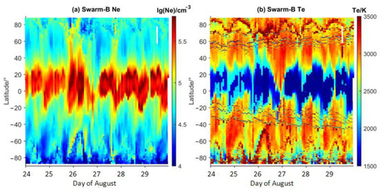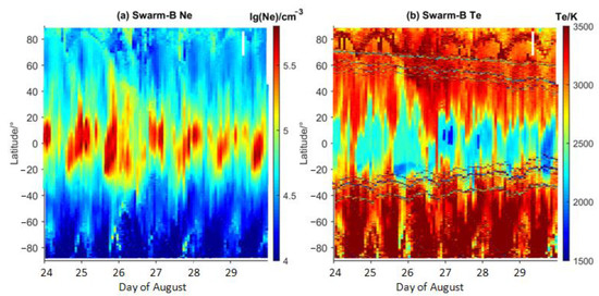 Among the three satellites of Swarm, Ne, and Te from satellite A and B, different altitudes were collected and plotted in Figure 6. For Swarm-A, the local daytime was mainly between 13:00–15:00 at low and middle latitudes from 24–29 August, being close to the local time of CSES at 14:00. However, the altitude of Swarm-A was 435–455 km, about 60 km lower than CSES. As shown in Figure 6, the similar evolutional features were detected from Swarm-A as those on CSES, with significant increases in Ne in the equatorial area following the last few hours on 25 August to the first few hours on 26 August and the enhanced equatorial Te valley at the same time. From 27–29 August, the peak equatorial Ne was still enhanced, and the double peaks were illustrated clearly at the altitude of Swarm-A. In the meantime, the strong valley in Te continued with an obvious extension to the southern side.