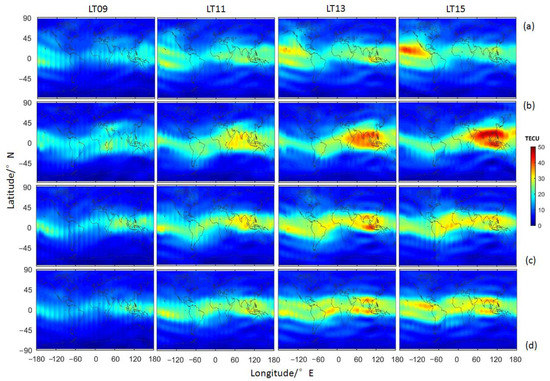 The global TEC mapping at local time 09:00 to 15:00 during 25–28 August in 2018 ((a)–(d) represents 25–28 August, respectively).