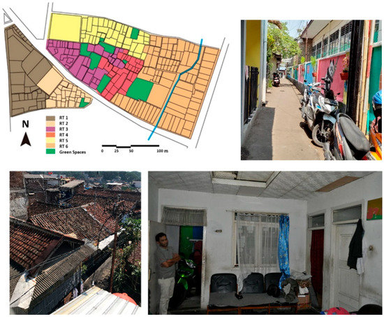 Bandung is the provincial capital city of West Java that is considered one of the densest cities in Indonesia [44]. A typical kampung neighborhood in the center of Bandung, Kampung Pasteur, comprising 360 households, was selected as the case study area. These unplanned houses accounted for 68.5% of the total existing housing stocks in Bandung [45]. It is located close to the main street, in the business district with a large shopping mall and traditional market nearby. The roads in the kampung were narrow, barely wide enough for one motorcycle to pass (Figure 1). The total area is 5.3 hectares, comprising six RTs (sub-neighborhoods). After obtaining consent from the head of the neighborhood association, the first field measurements and interviews were conducted during the dry season (September–November 2018) and the rainy season (March–April 2019). The second additional field measurement of particulate matter (PM) and total suspended particulate (TSP) was conducted in the next dry season (September–November 2019) based on the result of the first measurement. We interviewed a total of 599 respondents, i.e., 333 and 266 residents in dry and rainy seasons, respectively. These respondents were randomly chosen by visiting the houses in every certain interval. A total of 102 samples who agreed to participate in the measurement were selected for field measurements of mold risk (potential mold growth in the measured area), air temperature (AT), and relative humidity (RH), whereas 38 houses were selected for TSP and PM2.5 measurements (Table 1). These surveys and measurements were conducted before the COVID-19 pandemic and, therefore, there was no influence on the results.