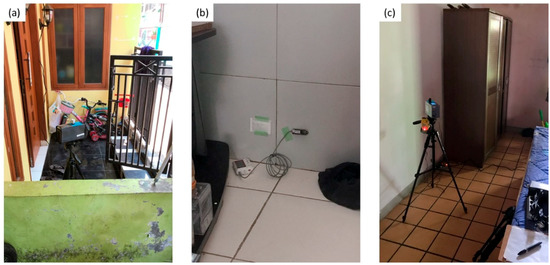 Measurement setting in the case study area, (a) PM2.5 and TSP sensor installed outdoor, (b) fungal risk detector for mold risk measurement, and (c) PM2.5 and TSP sensor installed indoor.