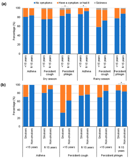 Self-reported respiratory health among (a) under 15 years old and 15 years and over and (b) smokers and non-smokers in both dry and rainy season. * 5% significant level.