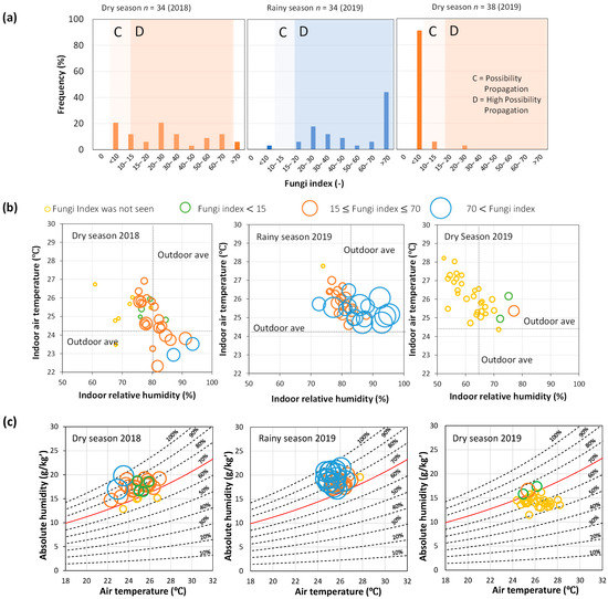 (a) Measured fungal indexes in kampung houses. (b) Relationship between thermal conditions and mold risk. (c) Measured fungal indexes in psychrometric charts (indoor thermal conditions).