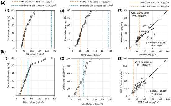 Cumulative frequency of (a) TSP and (b) PM2.5; (1) indoor, (2) outdoor, and (3) association between indoor and outdoor.