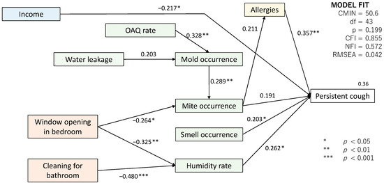 In this survey, persistent cough symptoms were found to be prevalent among those under 15 years old who suffered from allergies (Figure 6). This indicates that pre-conditions concerning health have a strong effect on cough symptoms. The allergic conditions can be caused by the occurrence of mites (0.211) and mold (0.061) in the house [63]. The perceived occurrence of mites is influenced by the perceived mold occurrence (0.289). Therefore, the mold occurrence is considered to be one of the key factors affecting the children’s cough symptoms. The mold occurrence is influenced by the perceived OAQ rates (0.328) and the perceived water leakage (0.203). Table 6a depicts the significant association between the perceived occurrence of water leakage in their houses and that of mold. This result implies that the water leakage may be one of the root causes of the children’s cough, although it does not directly trigger the cough symptoms (Table 6b).