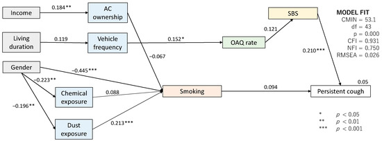 Figure 7 illustrates the results of the path diagram for those of 15 years old and over. The multiple correlation coefficient for cough symptoms is 0.05, indicating that the diagram only explains 5% of all persistent cough symptoms. However, the conformance value was reported sufficiently fit (CFI = 0.931, NFI = 0.750, and RMSEA = 0.026). This can be attributed to the fact that the percentage of those 15 years old and over suffering from persistent cough was smaller compared to that of children. As shown in Figure 7, the persistent cough among 15 years and over is highly affected by “Sick Building Syndrome (SBS)” (0.210), followed by “smoking (including active and passive smoking)” (0.094). In this study, the “SBS” indicates whether the health conditions of the occupants were worsened during the stay in their houses due to unidentified factors. However, these building-related health problems were found to be directly affected by the perceived OAQ, which was likely associated with the vehicle frequency with the total effect of 0.152. This indicates that traffic-related air pollution would degrade the OAQ.