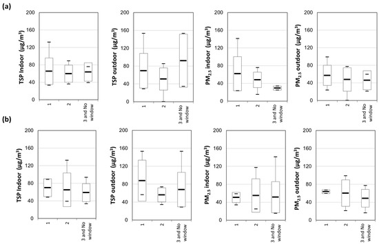 Indoor and outdoor TSP and PM2.5 concentration based on window-opening pattern in (a) living room and (b) bedroom.