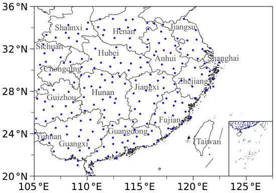The data used in this study include (a) daily precipitation data recorded at 753 stations provided by the National Meteorological Information Center of China (http://data.cma.cn/ (accessed on 16 May 2022)), which contains daily observation data of precipitation from China’s basic, base, and general meteorological stations (this dataset, the Daily meteorological dataset of basic meteorological elements of China National Surface Weather Station V3.0, has undergone a more stringent quality control, and suspicious and erroneous data have been manually verified and corrected by the National Meteorological Information Center of China. The integrity and quality of the data are great.), (b) global daily reanalysis data of wind field, geopotential height field, etc., provided by the United States National Centers for Environmental Prediction/National Center for Atmospheric Research (NCEP/NCAR), which is using a state-of-the-art analysis/forecast system to perform data assimilation using past data from 1948 to the present, [] (https://psl.noaa.gov/data/gridded/data.ncep.reanalysis.html (accessed on 16 May 2022)), (c) ERA5 daily reanalysis data of column-integrated water vapor flux and the corresponding divergence field, provided by the European Centre for Medium-Range Weather Forecasts (ECMWF), which combines model data with observations from across the world into a globally complete and consistent dataset using the laws of physics [] (https://cds.climate.copernicus.eu/cdsapp#!/search?type=dataset (accessed on 16 May 2022)), and (d) OLR data from the National Oceanic and Atmospheric Administration (NOAA), with gaps then filled with temporal and spatial interpolation [] (https://www.psl.noaa.gov/data/gridded/data.olrcdr.interp.html (accessed on 16 May 2022)). The data are all for 1980–2020. Due to the fact that the Chinese observation stations were built at different times, for the study purpose of this paper and to ensure the completeness and continuity of the data, we excluded the stations with less than 41 years of the length of the daily precipitation data from the 753 observation stations in China. Referring to Zhi et al. [] and Fu and Bueh [], southern China is defined as the region of 105–125° E, 20–35° N, within which there are 206 observation stations (Figure 1). Except for the daily precipitation data recorded at 753 stations (China), the horizontal resolution of the above data is 2.5° × 2.5°.