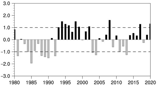 The normalized time series of the 206-station regional mean total summer precipitation in southern China from 1980 to 2020.