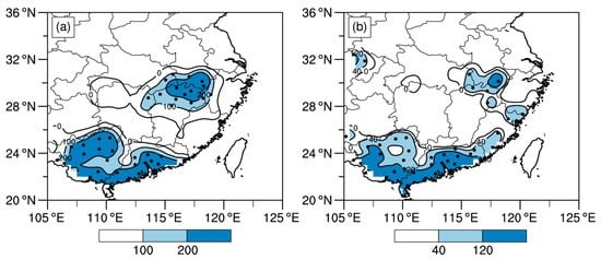 In order to find representative stations characterizing LF precipitation, the spatial deviation distribution of the annual mean total summer precipitation over 10 (9) flood (drought) years in southern China is given (Figure 3). The spatial deviation of precipitation is defined as the difference between the total summer precipitation at a single station and the 206-station regional mean total summer precipitation. It can be seen that the the spatial deviation of the total summer precipitation in flood years is greater than that in drought years. The maximum value centers of the precipitation deviation in flood years are located at the border of Guangdong and Guangxi, the junctions of Jiangxi, Anhui, and adjacent provinces, respectively. (Figure 3a). The locations of the maximum value centers of drought years are similar to those of flood years, but the precipitation deviation is also large at the border of Zhejiang and Fujian, the border of Fujian and Guangdong, and northeast Sichuan (Figure 3b). In total, 47 (deviation values ≥ 100 mm) and 50 (deviation values ≥ 40 mm) stations are selected as representative stations in flood and drought years, respectively, to further compare the LF characteristics of precipitation in flood and drought years.