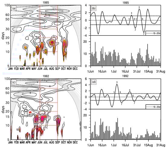 The Morlet wavelet analysis is performed on the representative-station regional mean daily precipitation series in each year of flood and drought years, respectively, and the significant LF periods are counted in Table 1. It is found that all flood and drought years have a significant LF period of 10–20 days. Figure 4 shows the wavelet analysis results of the representative-station regional mean of the daily precipitation series from January to December in 1995 (flood year) and 1992 (drought year) in southern China. In both 1995 and 1992, there is a significant 10–20-day LF period of precipitation series (Figure 4a,c). The LF components of 10–20 days (Figure 4b,d) reflect the intensity change of precipitation in each process. The precipitation is more (weaker) in the positive (negative) phase of 10–20-day LF components, which is similar to the findings of Li et al. [].