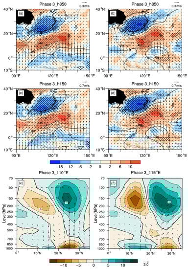 As seen in Figure 5, in phase 3, no matter if it is in flood years (Figure 5a,c) or drought years (Figure 5b,d), (a) there is strong convective development in southern China, accompanied by convergence (divergence) in the lower (upper) troposphere, which is conducive to the increase in LF precipitation, but the convection active center in flood years is further southward than that in drought years; (b) in the south of the convection active region, there is an east–west (from the Bay of Bengal to the sea area east of the Philippine Islands) and a northeast–southwest (from the South China Sea to the tropical northwest Pacific Ocean) convection-inhibitive region in flood and drought years, respectively, but the convection-inhibitive region is further westward (further eastward) in flood (drought) years; (c) are the convection-active region in southern China and the convection-inhibitive region in the South China Sea belong to the same vertical circulation system? To address this problem, the latitude-height vertical profiles and LF vertical-meridional circulation of the LF divergence fields of 10–20 days along 110° E (Figure 5e) and 115° E (Figure 5f) are given for flood and drought years, respectively. It can be seen that in flood years, most of the water vapor in southern Chin heads south to the low latitudes, converges, and sinks after rising to the upper troposphere (Figure 5e). In drought years, while the water vapor in southern China converges and rises, a considerable component turns northward (Figure 5f), which means that the vertical meridional circulation is stronger in flood years than in drought years, and the configuration of the LF circulation system in the upper and lower troposphere is also more baroclinic. It is more conducive to the release of unstable energy [] and the occurrence and maintenance of more LF precipitation.