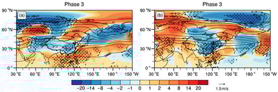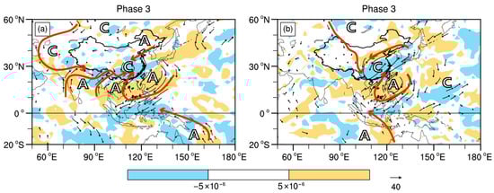 According to the 500 hPa height and wind field in flood and drought years composited by phase 3 of LF precipitation (Figure 6), on the one hand, no matter if it is in flood years or drought years, a LF “+”, “−”, and “+” East Asia-Pacific (EAP) teleconnection wave train anomaly is shown along the East Asian coast from south to north. Incidentally, the LF circulation in the mid-high latitudes of Eurasia is a “+”, “−”, and “+” anomalous wave train, forming a “two ridges and one trough” pattern. The positive anomaly in the north of the former wave train overlaps with the positive anomaly in the east of the latter wave train. On the other hand, there are obvious differences in the shape, position, and intensity of the circulation systems in the two wave trains in flood and drought years. For instance, the positive anomaly in the south of the EAP wave train is more extensive and extends westward than in drought years, causing the WPSH to become stronger and more obvious westward in flood years. It is noteworthy that in Figure 5a–d, the area near the Philippine Islands is an apparent heat sink region, which may also be one of the reasons why the WPSH is maintained at 20° N []. In flood years, the “two ridges and one trough” are generally more westward than in drought years, and the central through and eastern ridge have a greater meridional extent than in drought years.