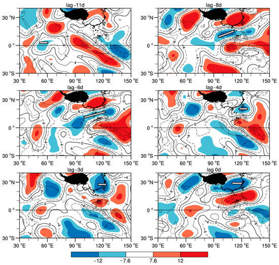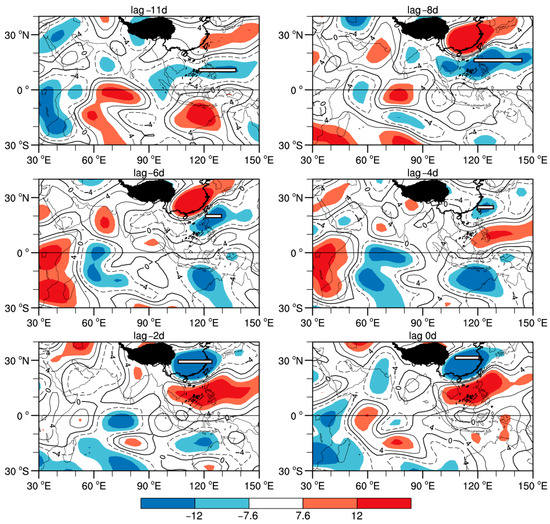 As demonstrated in Figure 8, from −11 to −6 days, the abnormally active LF convective signal in flood years first appears in Somalia and the equatorial Indian Ocean to the east (−11 days). Over time (−8 to −6 days), the convective signal develops and propagates from south of the Indian Peninsula to the Philippine Islands via the Indochina Peninsula along the southwest-northeast direction, and then enters southern China on −4 days. From −3 to 0 days, the LF convective signal moves northward to cover southern China and stays there continuously, leading to the occurrence of heavy LF precipitation.