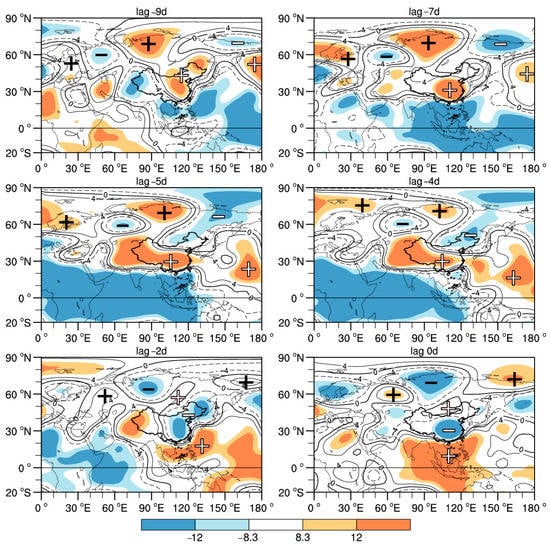 Firstly, the predictive signals related to EAP are found. On −9 days, there is a LF negative anomaly in the north of East Siberia. From −7 to −4 days, the negative anomaly strengthens significantly and gradually splits into northeastern China and the Bering Sea in the southwest and southeast direction, respectively. After that, the two negative anomalies move westward and southward, respectively. On 0 days, the two anomalies form a large northeast-southwest trough (similar to Figure 6a) from the east of the Kamchatka Peninsula to southern China. From −9 to −5 days, the LF positive anomalies in central and eastern China, northeastern China, and the Bering Strait gradually extend southward and strengthen. On −4 days, the positive anomaly, located in the area from the east of the Caspian Sea to the eastern coast of China, meets with the positive anomaly that moves southward to the central North Pacific Ocean and extends westward. Additionally, then the positive anomaly continues moving southward. On 0 days, a large area from the Indian Peninsula to the east of the Philippine Islands is controlled by a LF positive anomaly. At this point, the “+”, “−”, and “+” EAP teleconnection wave train has formed from south to north along the East Asia coast in the South China Sea, southern China, and the area from the east of Lake Baikal to East Siberia, respectively, which is conducive to the deepening of the East Asian Trough and the strengthening of the westward extension of the WPSH.