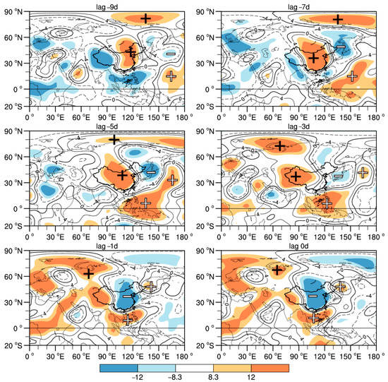 Subsequently, the predictive signals of “two ridges and one trough” at the mid-high latitudes of Eurasia are searched. As shown in Figure 10, on −9 days, there is an east–west “+”, “−”, and “+” LF teleconnection wave train in the area from Western Europe to the Mediterranean, on the Eastern European Plain, and in the Central Siberia. The wave train keeps intensifying and extending eastward over time. From −4 to −2 days, the original positive anomaly from Western Europe to the Mediterranean Sea and the original positive anomaly of Central Siberia are weakened in the eastward movement. On 0 days, the two positive anomalous signals are strengthened again and form the “+”, “−”, and “+” LF teleconnection wave train in the Ural Mountains, Central Siberia, and the area from Lake Baikal to East Siberia, respectively, which is favorable to the maintenance of the circulation of two ridges and one trough at mid-high latitudes. Combined with the LF EAP teleconnection wave train along the East Asian coast, the cold air from the high latitudes and the wet-warm water vapor from the tropics converge in southern China, causing the LF heavy precipitation.