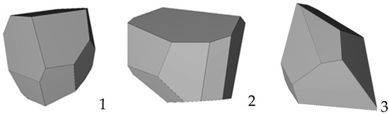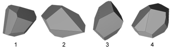 We have calculated the scattering matrixes of Equation (2) for the particle shapes of Figure 1 using our physical-optics method [14]. In the physical-optics method, the light inside a polyhedral particle of a large size is described by geometrical optics. As a result, the light inside the particle becomes a superposition of many plane-parallel beams with various transversal size and shapes propagating in different directions. After refraction by an exit facet, any beam is transformed into a diverging spherical wave according to the Fraunhofer diffraction. As a result, the scattered wave in the wave zone of the particle is a superposition of a large number of diverging spherical waves that are summarized by our code. The code also averages the scattered light over a random particle orientation; this procedure is denoted by the brackets < … >.