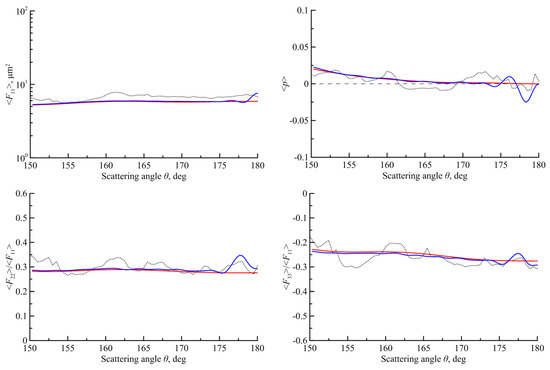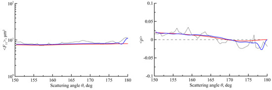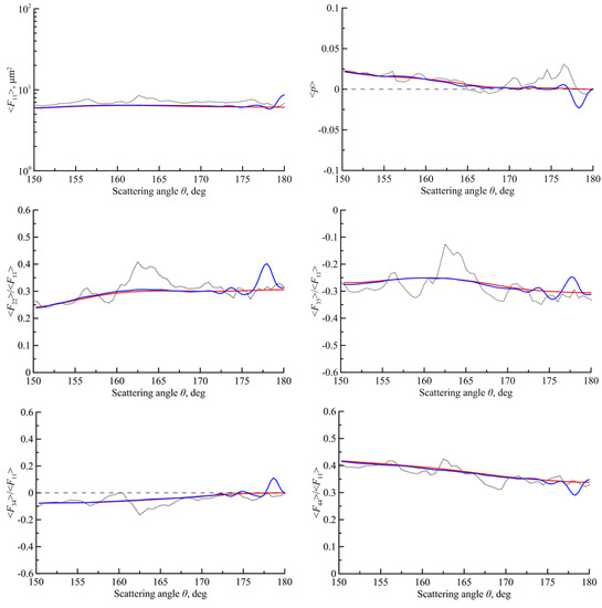 Figure 2, Figure 3 and Figure 4 show the scattering matrixes of Equation (2) obtained for three model shapes of Figure 1. Note that our code allows us to calculate the scattered light in three regimes: (1) geometrical optics, (2) incoherent summation (only diffraction), and (3) coherent summation (diffraction + interference). The geometrical optics regime is most crude. Here, any beam after refraction by an exit facet propagates straightforward to the scattering direction sphere , producing only a point on the sphere. The incoherent summation regime is more realistic. In this case, the Fraunhofer diffraction transforms the geometrical optics dot into a diffraction spot on the scattering direction sphere. Finally, the coherent summation regime is most exact. Here, the interference among the scattered waves has been taken into account that it is performed inside the diffraction spots. Three regimes have been shown by different curves in Figure 2, Figure 3 and Figure 4. The truncated curves correspond to the geometrical optics regime, and the solid blue and red curves are taken for the coherent and incoherent summations, respectively.