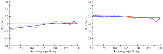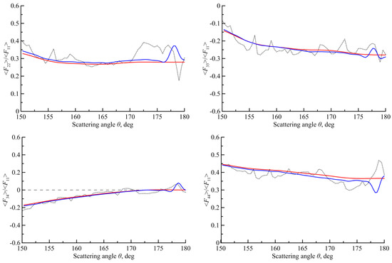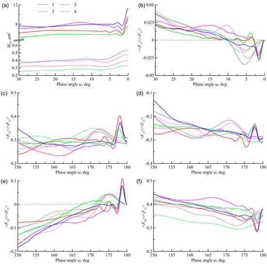 Let us comment on the results obtained in Figure 2, Figure 3 and Figure 4. The first element of the scattering matrix is the differential cross-section of the particle. Recently, we showed [36] that the differential cross-section for large particles of irregular shapes creates the coherent backscattering peak that was well known for random scattering media [21]. We see that the coherent peak appears in Figure 2, Figure 3 and Figure 4 for all particle models in the regime of coherent summation (blue curves).