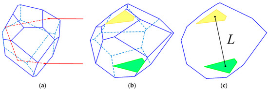 In a grazing-incidence trajectory, the light travels predominantly along the particle surface and then leaves the particle after refraction by an exit facet that produces a beam outgoing near the particle edge. An example of such trajectories is depicted in Figure 7. The light travelling along this trajectory in the inverse direction creates analogously the outgoing beam of the similar shape and size near the opposite particle edge as shown in Figure 7a. Our calculation shows that transverse size of a grazing-incidence beam a is less than the particle diameter D. Consequently, such a pair of the beams leaves a particle near the opposite edges of a particle at the distance L between them, shown in Figure 7c. For brevity, we call them a pair of conjugate beams.