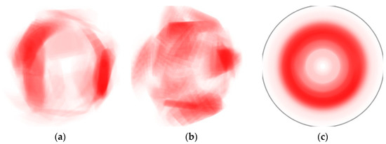 Distribution of the backscattered intensity over the particle projection obtained in the geometrical optics approximation for the beam trajectories with three (a) and four (b) internal reflections/refraction events averaged for two Euler angles of particle orientations. Here (c) is the average over random orientation.