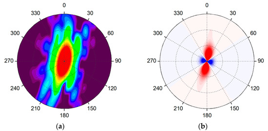 Assuming that the patterns of Figure 9 and Figure 10 are obtained at α = 0, it can be shown that at arbitrary α we obtain and , i.e., the elements and at the arbitrary turn α are equal to the same values at α = 0 but shifted azimuthally at . Consequently, the average over α reduces to integration of Figure 10 over the azimuth angle . Any line in Figure 10 is called a meridian. Assume that the zeroth meridian = 0 goes perpendicular to the stripes and the meridian = π/2 goes along the zeroth interference stripe. Figure 11 presents the polarization along these two meridians.