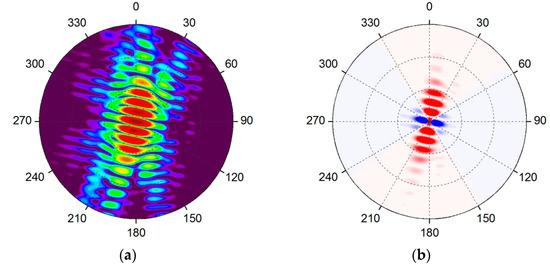 The polarization element of the Mueller matrix in Figure 10b should be nonzero within the same interference stripes as in Figure 10a. However, unlike the scattered intensity in Figure 10a, the magnitudes of in Figure 10b are sign alternating quantities. As a result, the zeroth-order stripe of Figure 10a has been transformed in Figure 10b into two oblate ovals touching at = 180°.
