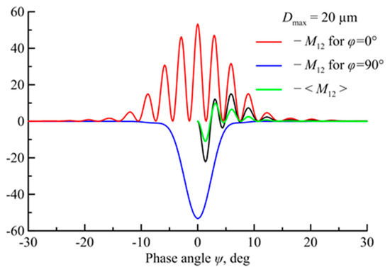 Figure 9 and Figure 10 are obtained for a fixed particle orientation shown in Figure 7, while we need to have the Mueller matrix averaged over random particle orientations. The procedure of averaging over particle orientations reduces to averaging over three Euler angles that includes also averaging over particle rotations around the incident direction. Let us denote a particle rotation over the incident direction by the angle α. It is the averaging over α that will be further considered in detail.