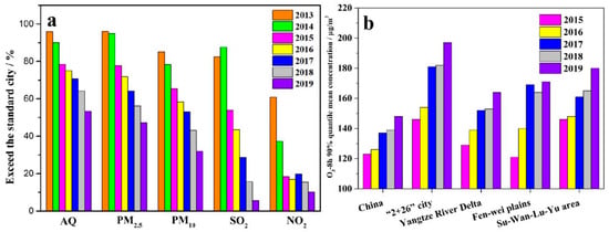 (a) From 2013 to 2019, the proportion of 337 cities in China whose pollutants exceeded the standard. (b) Quantile concentrations of O3-8 h of 90% in China from 2015 to 2019 (Figure drawn by the authors with the data source from Ref. [2]). (The “2 + 26” city refers to air pollution transmission channels in Beijing–Tianjin–Hebei and the surrounding areas. Yangtze River Delta includes the city of Shanghai and the provinces of Jiangsu, Zhejiang, and Anhui. Fen-wei Plain contains 12 cities and 2 districts in the provinces of Shaanxi, Shanxi, and Henan. Su-Wan-Lu-Yu area contains 22 cities in the provinces of Jiangsu, Anhui, Shandong, and Henan).