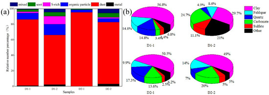 Relative number percentages of different particle types (a) and dust particles (b) during (D1-1 and D2-1) and after (D1-2 and D2-2) severe spring dust storm periods (Da–b: (a) for site, (b) for time). (Reprinted with permission from Ref. [33]. Copyright 2021, Elsevier B.V.).
