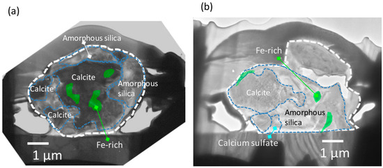 Deduced internal heterogeneous chemical and mineralogical structures within the cross-sections of Dust Particles 1 (a) and 2 (b) based on the results of TEM, EDS, and SAED analyses [80].