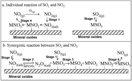 Reaction mechanism of (a) the individual reaction of SO2 and NO2 to form MSO3 and MNO3, and (b) the synergistic reaction between SO2 and NO2 to form MSO4 and MNO3 on the surfaces of mineral particles (NO2 = 200 ppmv, SO2 = 200 ppmv). (Reprinted with permission from Ref. [76]. Copyright 2012, Royal Society of Chemistry).