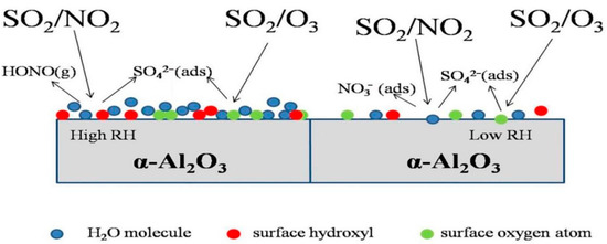 Effects of RH on O3 and NO2 oxidation of SO2 on α-Al2O3 particles. (Reprinted with permission from Ref. [27]. Copyright 2017, Elsevier Ltd.).