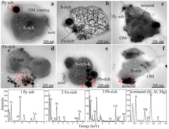 TEM images of the mixing states and EDS spectra of individual particles. (a) Mixture of S-rich, fly ash, soot, and coated by organi cmatter; (b) Mixture of S-rich and Fe-rich particles; (c) Mixture of mineral, fly ash, and OM; (d) Mixture of internally and externally mixed Fe-rich particles with S-rich and organic matter; (e) Mixture of S-rich-K, soot, and Pb-rich particles; (f) Mixture of S-rich, mineral, and organic matter. Compositions in the red circle on individual particles were examined by EDS. (Reprinted with permission from Ref. [82]. Copyright 2018, Elsevier B.V.).