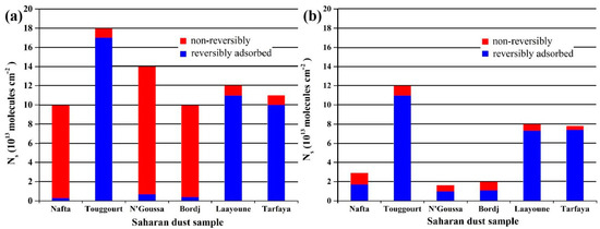 Reversibly and non-reversibly adsorbed amounts of (a) limonene and (b) toluene on each Saharan dust sample. (Reprinted with permission from Ref. [109]. Copyright 2016, American Chemical Society.)