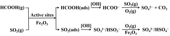 2. Small-molecule organics inhibit or promote the reactions by binding to or acting as a bridge between the particulate surface and the pollutant gas. Wu et al. [119] found that formic acid and SO2 competed for adsorption on α-Fe2O3, which has a higher affinity to SO2, and only a small amount of formic acid was absorbed on its surface to form formate. However, a small amount of formate on the surface of α-Fe2O3 was catalyzed by SO2 in the gas phase to form CO2, which further promoted the conversion of SO2 in the gas phase to sulfate (Figure 10). This indicates that formic acid and SO2 had a synergistic effect on α-Fe2O3. Li et al. [120] further systematically investigated the effects of dicarboxylic acid salts (including oxalate, malonate, and succinate) on the heterogeneous SO2 transformation with hematite nanoparticles, using a film flow reaction and in situ DRIFTs experiments. It was observed that trace amounts of dicarboxylic acid salts significantly accelerated the sulfate formation under solar light. In addition, the absorption of SO2 increased with the increase in light intensity, and the Fe-oxalate complexation under light irradiation also enhanced the solubility of iron.