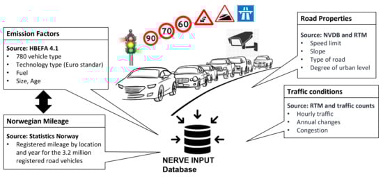 The NERVE model was originally designed to calculate climate gas emissions from road transport in Norwegian municipalities [36]. It is an open source model distributed under a general public license (GNU). More recent additions to the model include diversification to calculate air quality components, hourly output on road links, and an update of the Handbook Emission Factors for Road Transport (HBEFA) version 4.1 emission factors, which are presented here. NERVE is based on highly detailed input data on roads, vehicles and emission factors for Norway. The type of input data is, for the most part, readily available in other countries. Thus, the NERVE model has also been adapted to estimate traffic emissions for Abu Dhabi Emirates [37], urban areas abroad such as Dublin, Ireland [38], and currently also in Warsaw, Poland. It has also been used to investigate the effects of environmental speed limits on emissions [39], to relate tire wear particles and CO emissions [40] for global applications, and in numerous local air quality assessments [41,42,43]. This study is based on the Norwegian input data, which are described in Figure 1 and in the following sections.