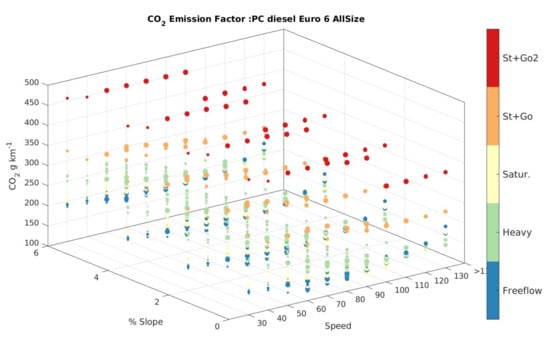 Figure 2 shows the CO emission per kilometer of a Euro6 diesel PC for each of the driving conditions (free flow, heavy, saturated, stop and go, and stop and go2) under varying speeds and slopes. CO EFs of the vehicle in Figure 2 vary from about 80 to 450 g km. The highest emission factors are obtained for heavy congestion (St+Go2), where the driving cycle involves extensive acceleration and braking, which increase emissions from a baseline of about 80 g km to above 300 g km for all other variables. Road gradient, here given as a two-way slope (i.e., a kilometer with a slope of 2% first driven up, then down), is the second most influencing factor, along with signed speed and road type, which also have a significant influence on emissions. At the level of detail to which NERVE is built, it is crucial to have a well-defined road network so that the actual traffic conditions of the vehicles are well matched and accounted for. This level of detail is also necessary to capture geographical differences in emissions.