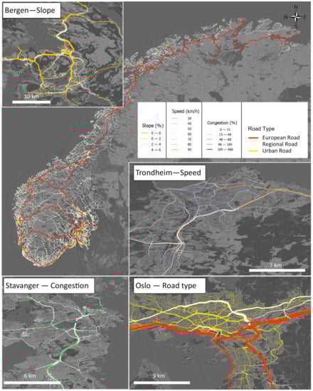 In each of the subplots of Figure 3, the thickness of the line of each road is proportional to the ADT. Each trafficked road segment from RTM is matched to a HBEFA corresponding road type based on speed, city (all Norway map) and type (details also in [36]). Road properties are important input as, for most vehicles, emissions can vary by a factor of four or more between different driving conditions. In Oslo, the roads are colored by main type (Figure 3), where the European and regional roads have about 20% of the total traffic whilst making up less than 1% of the total road network. The main roads in Bergen are relatively flat (Figure 3), and so while the road network and terrain have mostly steep slopes, a significant portion of the traffic is on flat roads. Inside Trondheim, the signed speed is highlighted by color, whereas in most cases, the largest roads have a high speed limit. The congestion in Stavanger is perhaps the most relevant feature for determining the HBEFA emission factor for these roads. Congestion varies, and even densely congested roads will also have a portion of uncongested traffic. For congestion, the travel time in the morning (7:00–9:00) and evening rush (15:00–17:00) is in NERVE compared to that on an uncongested travel time and presented as % delay. Based on a sample of roads with congestion, counting indicates that about 40% of the traffic is during rush hour. Based on the % congestion, NERVE places a fraction up to 40% in ‘stop+go’ situations. Only a limited amount of roads have rush hour congestion from RTM, mainly in and around the four largest cities. As a result, slightly less than 1% of vehicle kilometers driven in Norway are in a state of congestion.