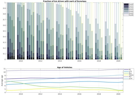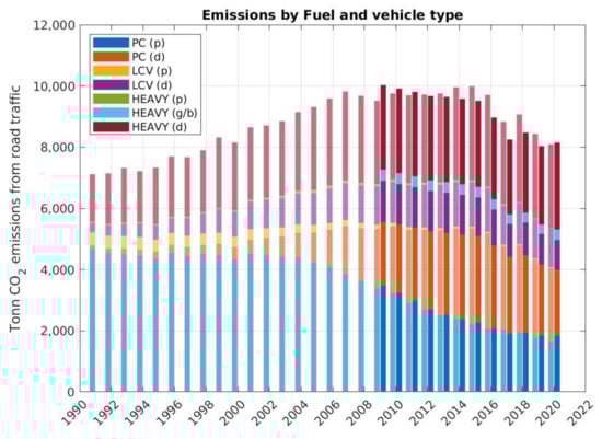 There exist a wide range of methods to estimate emissions, largely dependent on their purpose. Our use of detailed bottom-up emissions offer great opportunities. It allows identifying which measures have a stronger impact and establishing links between emissions and specific policies implemented at the local level or even to socioeconomic factors. Similar bottom-up methods have been used worldwide to investigate both air pollutants and GHGs from road traffic on a local scale (e.g., [25,26,27,28]). However, there are uncertainties in large-scale bottom-up inventories, as they are sensitive to the initial assumptions of emission factors and activity data. On the other hand, while offering little detail, national-scale inventories based on fuel sales provide a robust estimate to compare national numbers. Reports of national emissions are used for regulatory purposes as part of international agreements (e.g., the Paris Agreement on climate change) or directives (e.g., National Emission reduction Commitments, NEC-Directive). Sector-specific national emissions of both GHGs and air pollutants are reported separately to the United Nations Framework Convention on Climate Change (UNFCCC) and the Convention on Long-Range Transboundary Air Pollution (CLRTAP), respectively. Member states select input data and methods for each sector following existing guidelines and recommendations (e.g., [29,30]).
