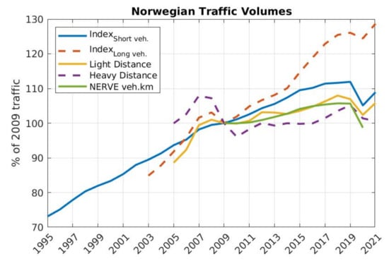 The year-to-year change in traffic as a whole is shown in Figure 5, as measured by different metrics. After the recovery from the global financial crisis in 2009, traffic volume has increased every year until 2020 by all available metrics. The traffic index is published by Norwegian Road Authorities and has, since 2003, been separated into short and long vehicles. The index is based on traffic counts, and the short index should, therefore, in theory, be similar to the national index of NERVE (green line), which is based on roughly the same traffic counts. The National index of NERVE resembles the total driving distance of the vehicle registry. The exact reason for this is unknown, as the method for the traffic index is poorly documented.
