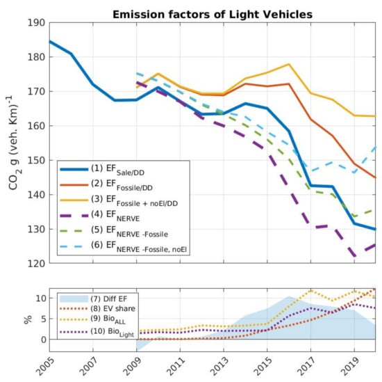 Emissions and derived EFs obtained with the NERVE model are compared to fuel-sales-based estimates. In Figure 7, the solid lines (1–3) represent EFs derived from fuel sales emissions produced by dividing total emissions from light vehicles by the driving distance of such vehicles (see Figure 4), whereas the dashed lines (4–6) represent the estimated EFs from the NERVE model. Both EFs decrease from around 170 g km in 2009 to about 130 g km in 2020. In the period between 2009 and 2012, the difference between the two sets of EFs is minimal before increasing to about 10% in 2016 (Figure 7 bottom). Figure 7 also includes two series of EFs, which are obtained by adjusting for the effect of bio-fuels (2 and 5), and the combined effect of bio-fuels and electric vehicles (3 and 6). The difference between the adjusted EFs and the total vehicle fleet EFs indicates the main cause of the reduction in emission factors.