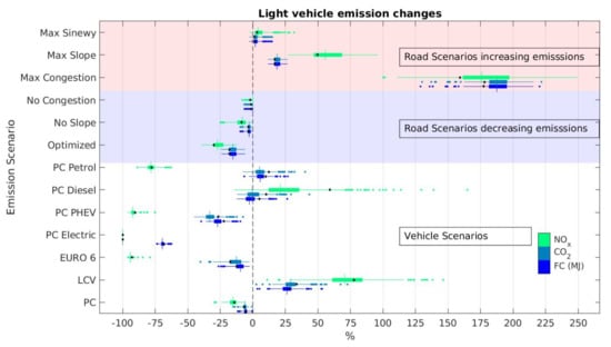 While it is not directly possible to disentangle each component that determines road emissions based on NERVE, Figure 9 shows scenarios where we changed a single component of road or vehicles at the same time. This serves to illustrate the relative influence of each factor on CO and NOx emissions, along with fuel consumption. This enables an evaluation of the sensitivity to change and the relative importance of each factor. The vehicle changes are also a good indicator of how emissions may change in going forward.