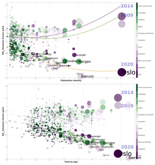 The largest and most densely populated urban center is Oslo. Several of the larger surrounding municipalities follow in population density along with the other main cities in Norway. In 2009, there was a positive relation between population density and the NOx emission factor (fitted green line in Figure 10). The main reason for this is that these areas have congestion, for which NOx emissions are more sensitive than other compounds (see Figure 9). Following sales, an increased diesel share increases NOx emissions in the most densely populated areas. In 2014, NOx emission factors were lower than those in 2009 in low population density areas, presumably as a result of new vehicles being introduced predominantly near the urban centers and used PCs (predominantly petrol vehicles) being sold as second-hand vehicles outside metropolitan areas. The effect of the policy thus led to increased NOx emission in urban areas, resulting in continued exceedance of the NO limit value in areas where many people live. Conversely, in 2020, high populated areas exhibited the lowest NOx EF in Norway, whereas the highest were observed in low-populated areas (fitted yellow line in Figure 10). This is because all new vehicles sold today have lower NOx emissions than any old vehicles.
