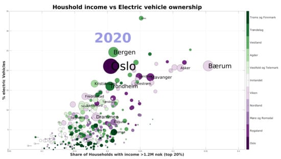 Even though the use of BEVs entails several advantages, there have been controversies regarding their overall sustainability. Environmental equity concerns have been pointed out in light of BEV’s accessibility by higher socioeconomic consumers [57]. Based on the data in NERVE, it is not possible to directly link economic data to car ownership on an individual vehicle basis. However, on a municipality level, there are several economic indicators that can be coupled with the data from NERVE. One example is the household income decile, while others include household income, Gini coefficient and other private wealth parameters [56]. Figure 11 shows the share of the population with income in the top two income deciles and the BEV share of the same municipality. Figure 11 and the data for 2020 in Figure 10 share several features.