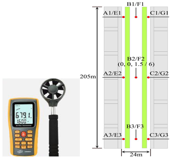 According to the conditions of the measured area and the measured geometric characteristic data from the street valley, ICEM-CFD is used to construct the measured model. The actual height measured at this time is the pedestrian breathing height at 1.5 m from the ground and at a height of 6 m. The monitoring surface of the street valley model and the location of the monitoring points are shown in Figure 2, yielding a total of two monitoring surfaces and 18 monitoring points. Figure 2 shows the measuring instrument and diagram of the monitoring points.