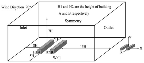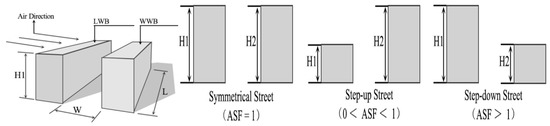 A typical urban street canyon model is shown in Figure 3. The incoming wind direction is perpendicular to the buildings. If the heights of the buildings on both sides of the street are equal, the layout is known as a symmetrical street canyon; otherwise, it is known as an asymmetric street. Asymmetric streets are divided into two categories, according to the ratio of building heights on both sides (ASF); namely, LWB (windward-side building height): WWB (downwind-side building height). If the taller buildings are located on the leeward side (0 < ASF < 1), it is called a step-up canyon, and if the lower buildings are located on the leeward side (ASF > 1), it is called a step-down canyon [21].