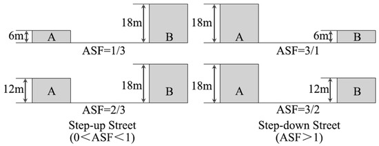 With reference to Gromke et al. [22], who reported wind tunnel tests conducted at Karlsruhe University in Germany, the best guidelines for the CFD simulation of atmospheric flow in urban environments are from the EU’s multinational long-term cooperation action plan for quality assurance and the improvement of microscale meteorological models (COST ACTION 732), along with the Implementation Guidelines for the CFD Simulation of Pedestrian-level Wind Around Buildings, proposed by the Architectural Institute of Japan [23,24,25]. These can be used to determine the computational domain and the shallow street canyon experimental model, where building height H = 18 m, street canyon width W = 36 m, and street canyon length L = 180 m; on this basis, according to the different ratios of building heights (ASF) on both sides of the street canyon, the quantitative design of the asymmetric street is carried out. The Residential Design Code requires that “each floor of residential buildings is 3 m high” [26] and the regulations on building height in the document “Opinions on Strengthening Green and Low-Carbon Construction in County Towns”, issued by the Ministry of Housing and Urban-Rural Development: “The proportion of residential buildings with 6 floors and below should not be less than 70%” [4]; therefore, the height of the buildings on both sides of the street canyon should not exceed 18 m, forming a step-up street, namely, ASF = 1/3 and 2/3 (Figure 4), while the building heights on both sides are A = 1/3 H = 6 m and 2/3 H = 12 m, B = H = 18 m, and the descending street canyon is ASF = 3/1 and 3/2, the building heights on both sides are A= H = 18 m, B= 1/3 H = 6 m, and 2/3 H = 12 m, respectively. Figure below shows the asymmetric street plan.