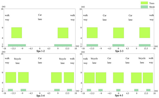 The study focuses on the influence of the road green belt shape on the airflow at the pedestrian breathing height in the street canyon (Y/H = 1.5), establishing the same road width and plant configuration as set. In the “Code for the Design of Urban Roads”, the “width of motor vehicle lanes and pavement” stipulates that the width of a single lane should not be less than 3.5 m [27] but, in reality, most motor vehicle lanes are a two-way four-lane road [20], so the more common two-way road is selected in this case. With four lanes, the width is stipulated to be 14 m; the “non-motor vehicle lane width” in the “Code for Design of Urban Road Engineering” should not be less than 3.5 m [28], so in this scheme, the width is designed to be 3.5 m; according to the layout of the road green belt (the spacing and the number of green belts), we established 5 sets of scenes: the first space is treeless and without green belts, while the other four use green-belt layouts with 4 different green-belt widths (Figure 5). The “Green Belt Design for Vehicles” in the “Code for Greening Planning and Design of Urban Roads” stipulates that the width of the green belts for planting trees should not be less than 1.5 m [29]; therefore, their widths are set at one board and two green belts, respectively (Spa1-2 = 9 m), the two-plate three-belt type (Spa2-3 = 6 m), the three-plate four-belt type (Spa3-4 = 2.75 m), and the four-plate five-belt type (Spa4-5 = 2.25 m).